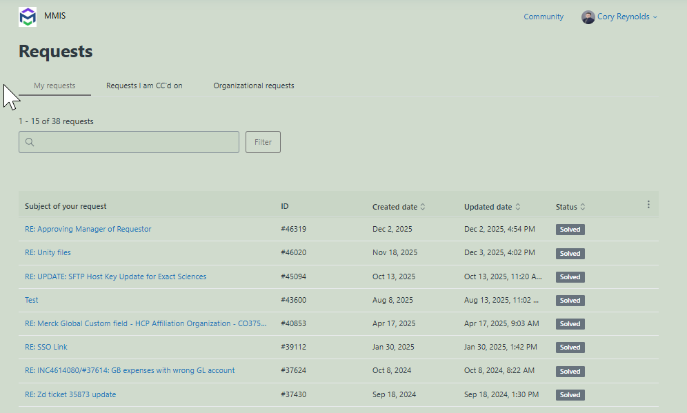- The Requests page will appear with three tabs: My requests, Requests I’m CC’d on, Organization requests. This will allow you to see items pending your reply as well as those awaiting action from development.