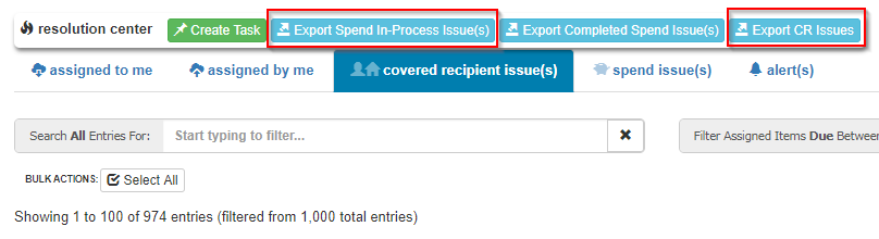 There is functionality within the Resolution Center to export spend transactions in progress as well as an option to export CR issues at the top of the page.